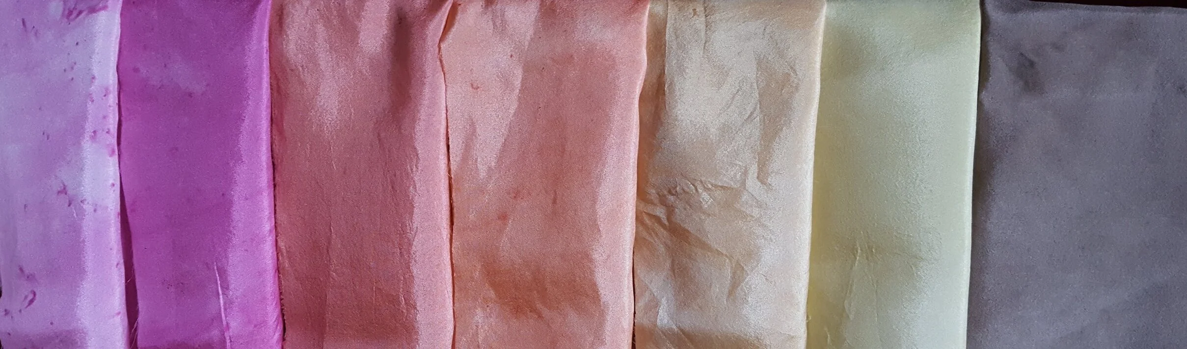 I'm teaching a Nature Art class once a week at a local elementary school. Our 8 week class is culminating with dyeing playsilks with natural dyes. I dyed up some samples so the kids can see what's possible. I'm not including indigo in this class so I don't have any blues or bright greens but I'm sure the kids will find a color they like from these options!
