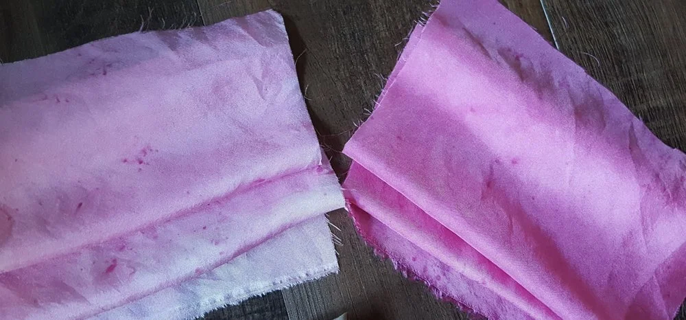 These were dyed with cochineal at two different strengths. I didn't measure but added just a tiny sprinkle to the jar with the fabric on the left and a little pinch to the one on the right. Cochineal is very strong and it doesn't take a lot to create rich colors. The speckles on the fabric are there because I didn't strain the cochineal out before adding the fabric.