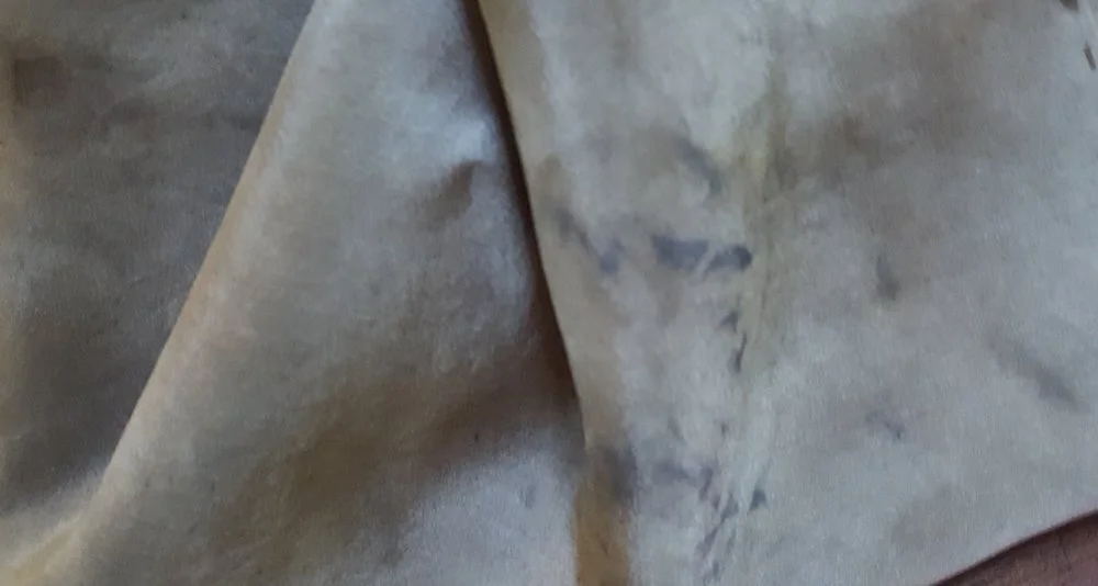 This silk was simmered with several whole back walnuts then left to soak in the walnut water for over a day. it's a rich brown with beautiful darker markings where the fabric was touching the walnuts.