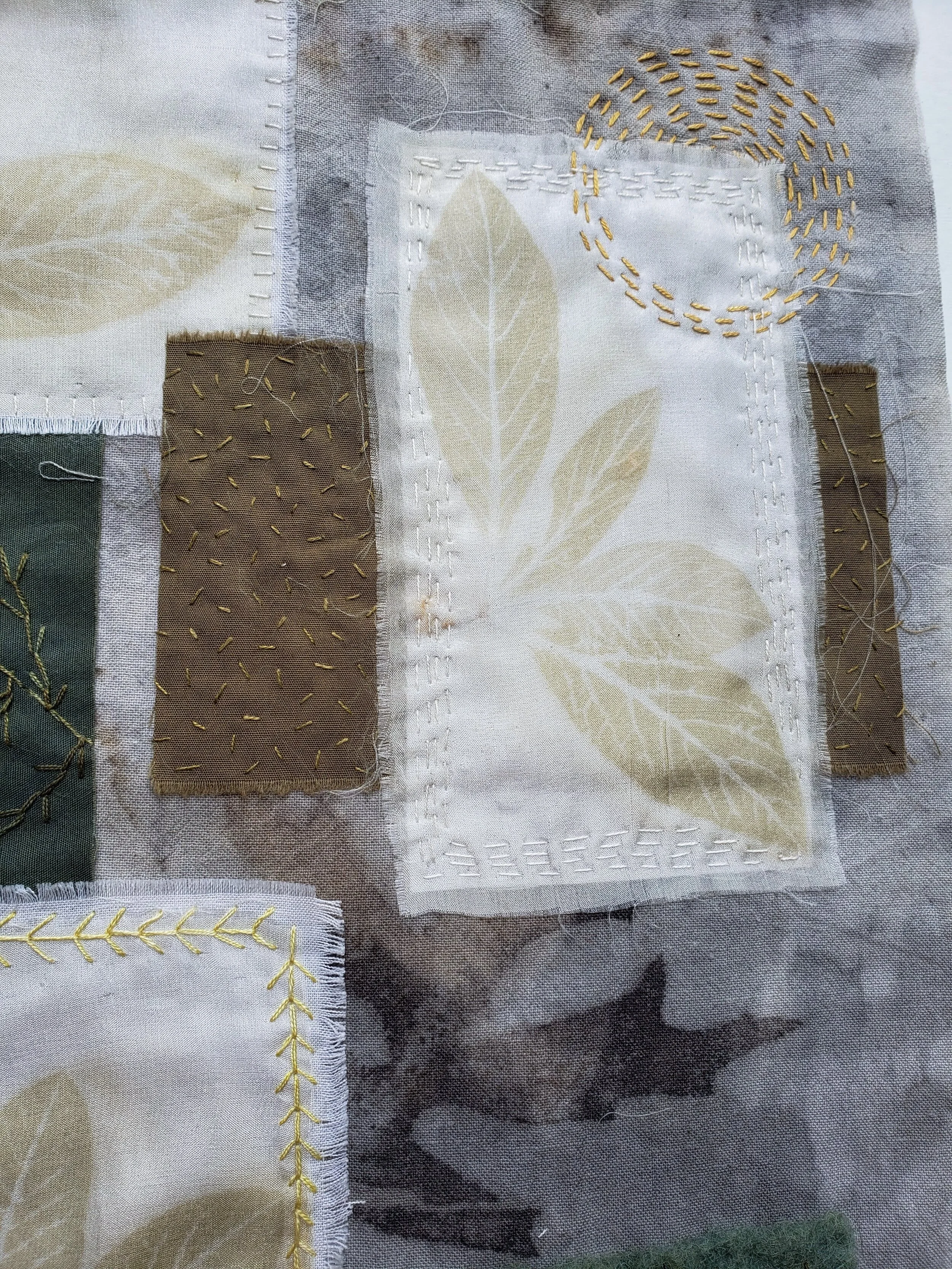 The backing is cotton, dyed gray with some dark ecoprints of leaves. I hand stitched naturally dyed and ecoprinted silk, cotton, and wool felt pieces onto the backing and secured them with a variety of hand stitched patterns. All the stitching was done using silk embroidery floss that I dyed myself using natural dyes. You can read more about my dye process for some of the silk floss here. It is so lovely to stitch with and most colors have some slight variegation that adds a richness to the stitching that commercial colors don’t have. Floss that I used was dyed with dyer’s polypore mushrooms, onion skins, indigo, weld, and combinations of those. (You can see all my naturally dyed silk embroidery floss by clicking here.)