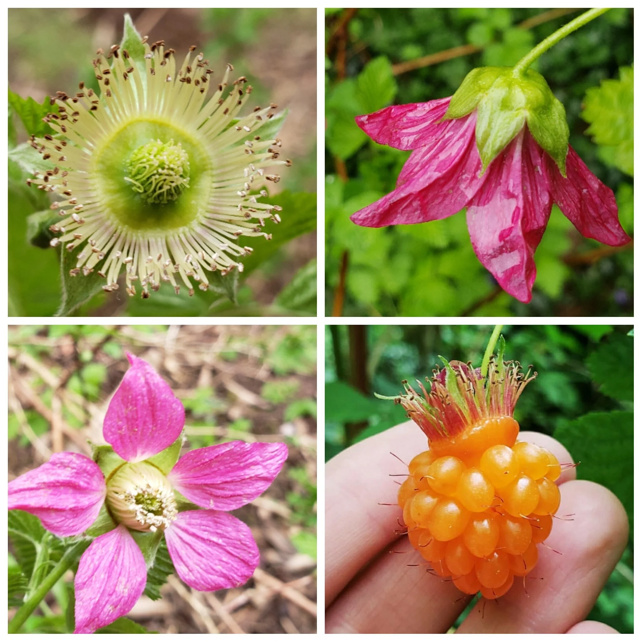 I’m working on a series of textile pieces that are inspired by some of my favorite plants in the forest surrounding my home and studio at Cedar Dell Forest Farm. The first that I’ve completed is a wall hanging showcasing the beautiful salmonberry plant. This plant has dark pink flowers that bloom in early spring. The leaves have hardly emerged by the time the delicate flowers are in full bloom. After the petals fall to the ground, the many stamens spread into a halo and ultimately form what looks to me like a crown on the top of the bright orange berries. Some of these elements are incorporated into my piece, as well as botanical prints of the leaves.