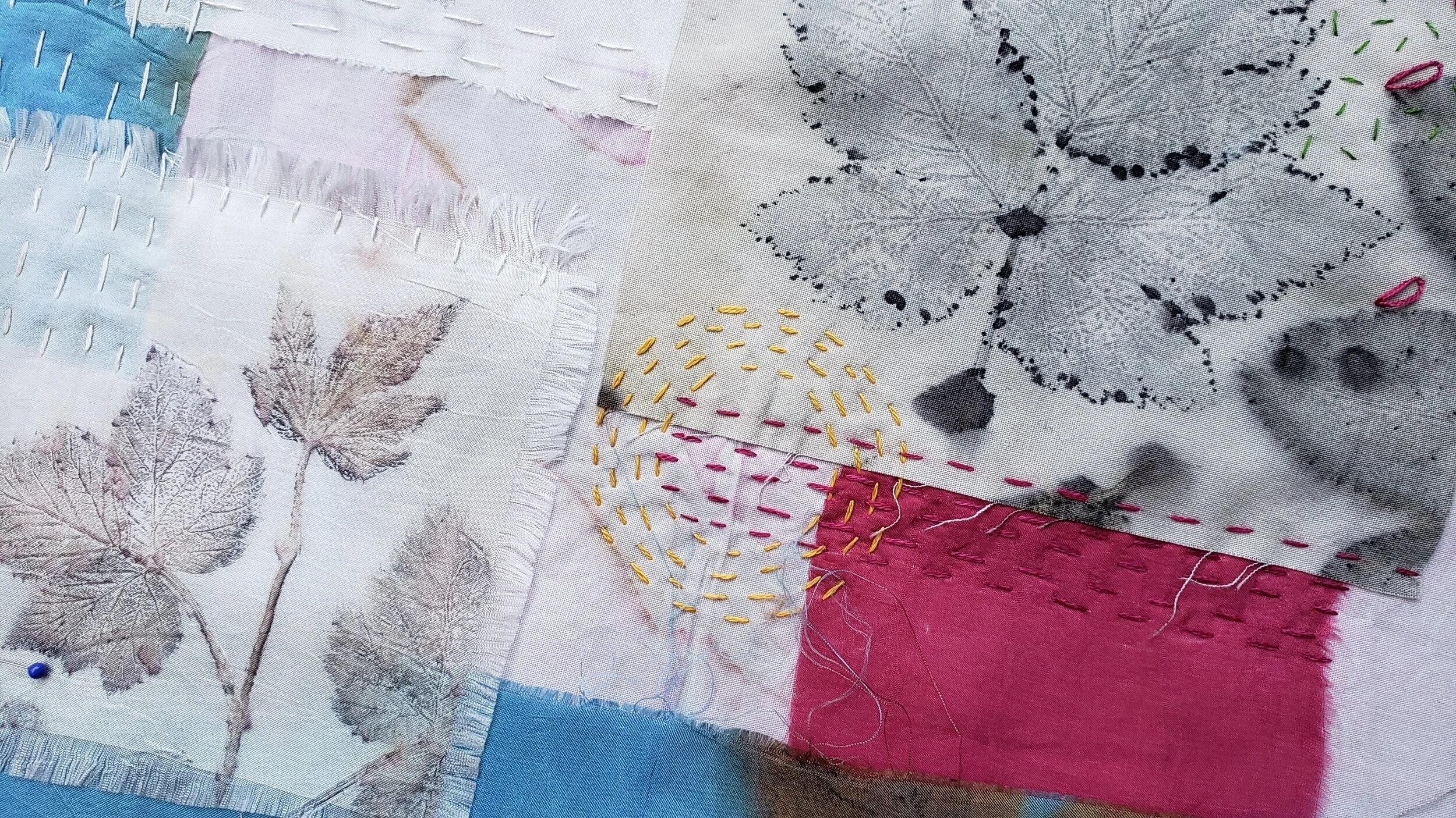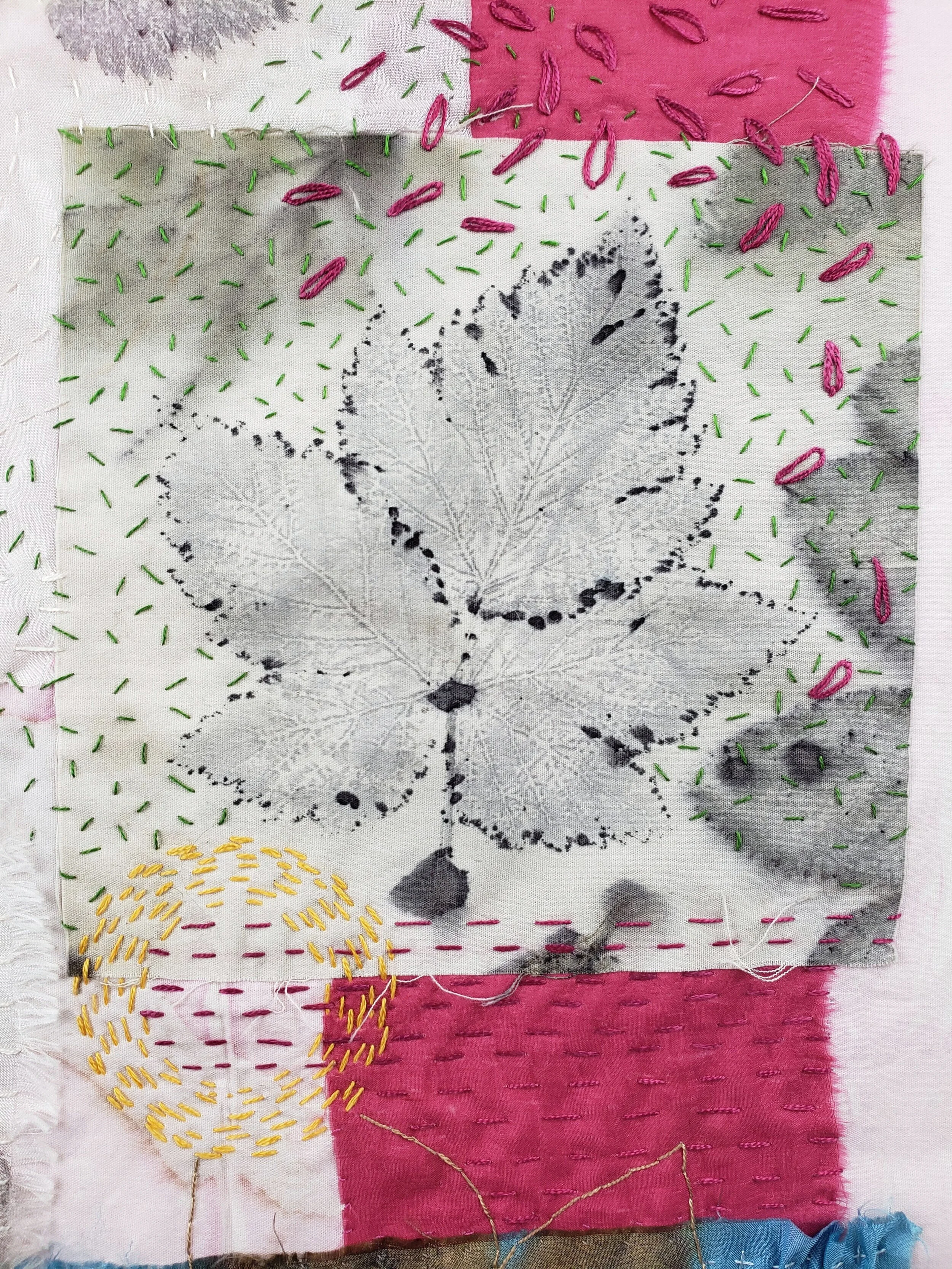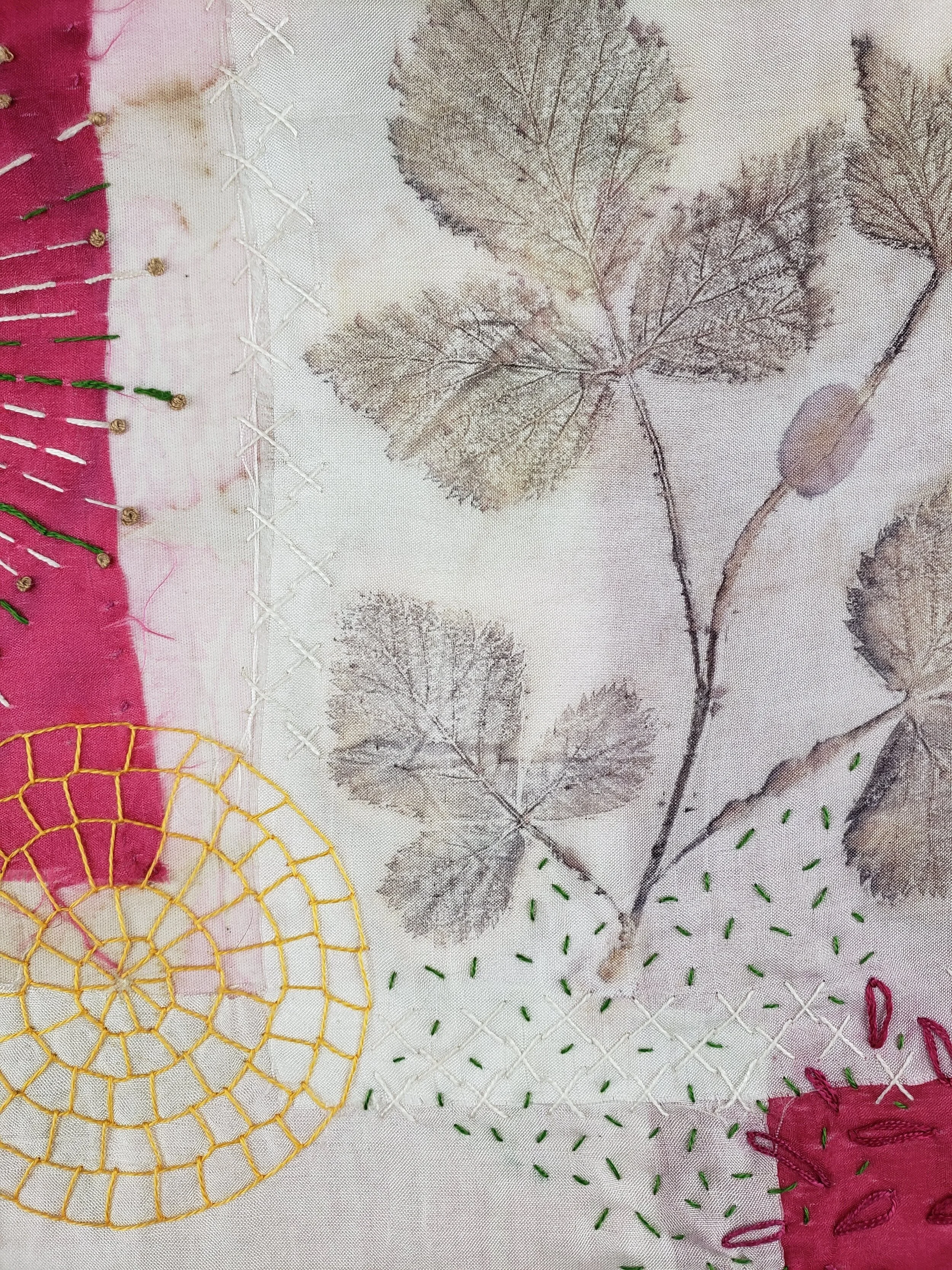 The backing is cotton, lightly dyed with cochineal, that has some faint leaf prints as it was bundled with a scarf that I eco printed. I hand appliqued naturally dyed and eco printed silk pieces onto the backing and secured them with a variety of hand stitched patterns. All the stitching was done using silk embroidery floss that I dyed myself using natural dyes. You can read more about my dye process for some of the silk floss here. It is so lovely to stitch with and most colors have some slight variegation that adds a richness to the stitching that commercial colors don’t have. I usually dye enough to sell some to others and you can see what’s currently available in my shop.